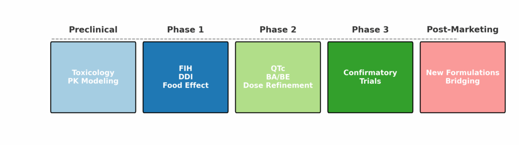 Phase 0–1: PK/PD, food-effect, DDI studies